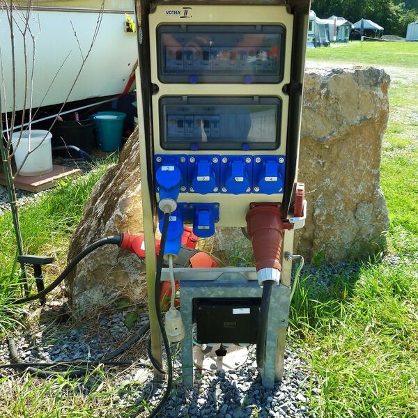 | Strom | Bei den Stellplätzen. 6 Ampere je Anschluss |