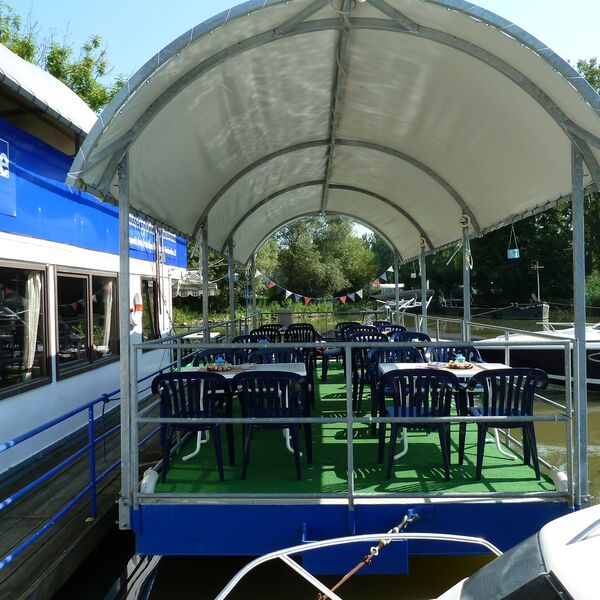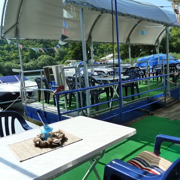 Auf unserem Ponton direkt auf dem Wasser, können Sie Ihren Abend bei einem schönen Glas Wein aus der Region, ausklingen lassen.
